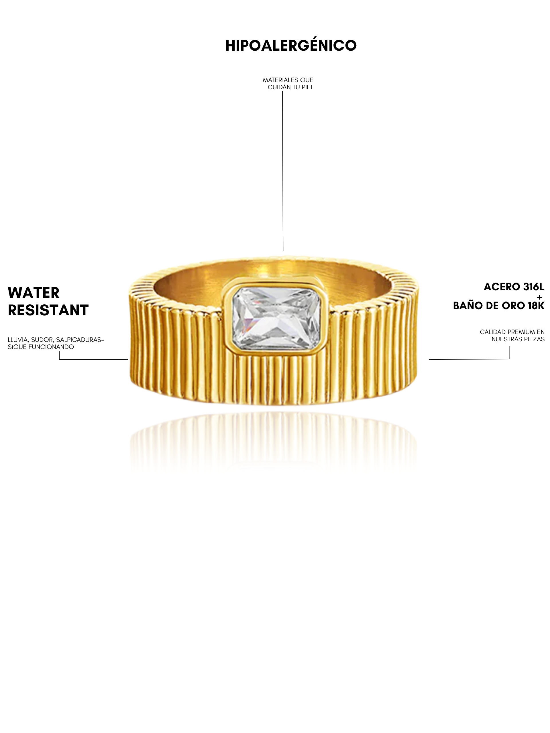 Fabricamos con acero quirúrgico 316 L y baño de oro 18 K. Resistentes al agua, sudor y vida diaria.