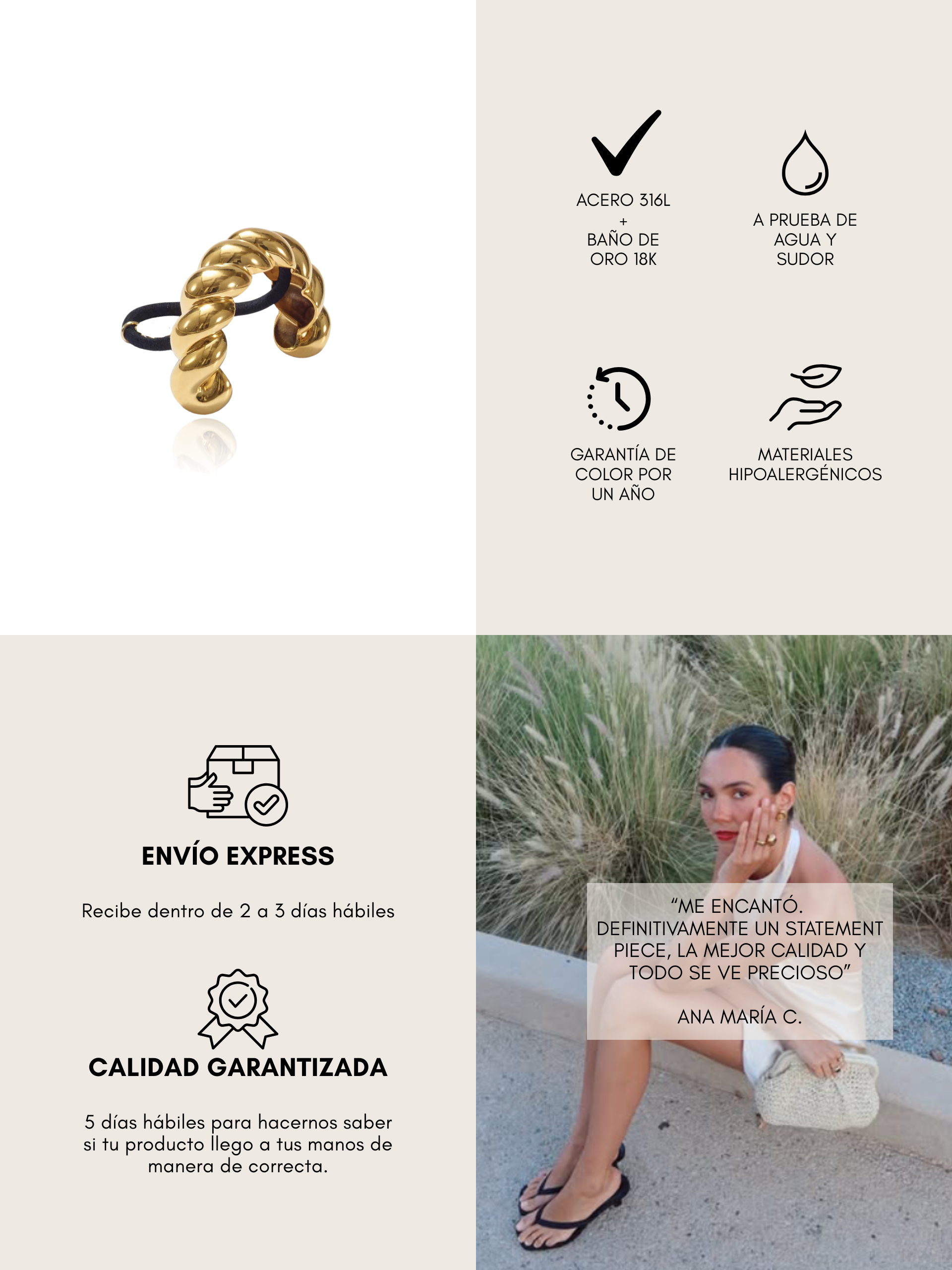 Todas nuestras piezas son de acero inoxidable resistente al agua, diseñadas para acompañarte todos los días sin perder brillo ni color.