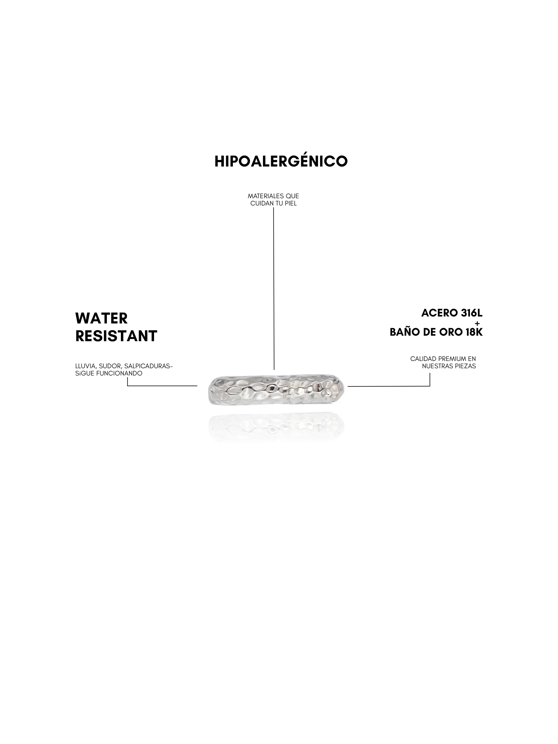 Todas nuestras piezas son de acero inoxidable resistente al agua, diseñadas para acompañarte todos los días sin perder brillo ni color.