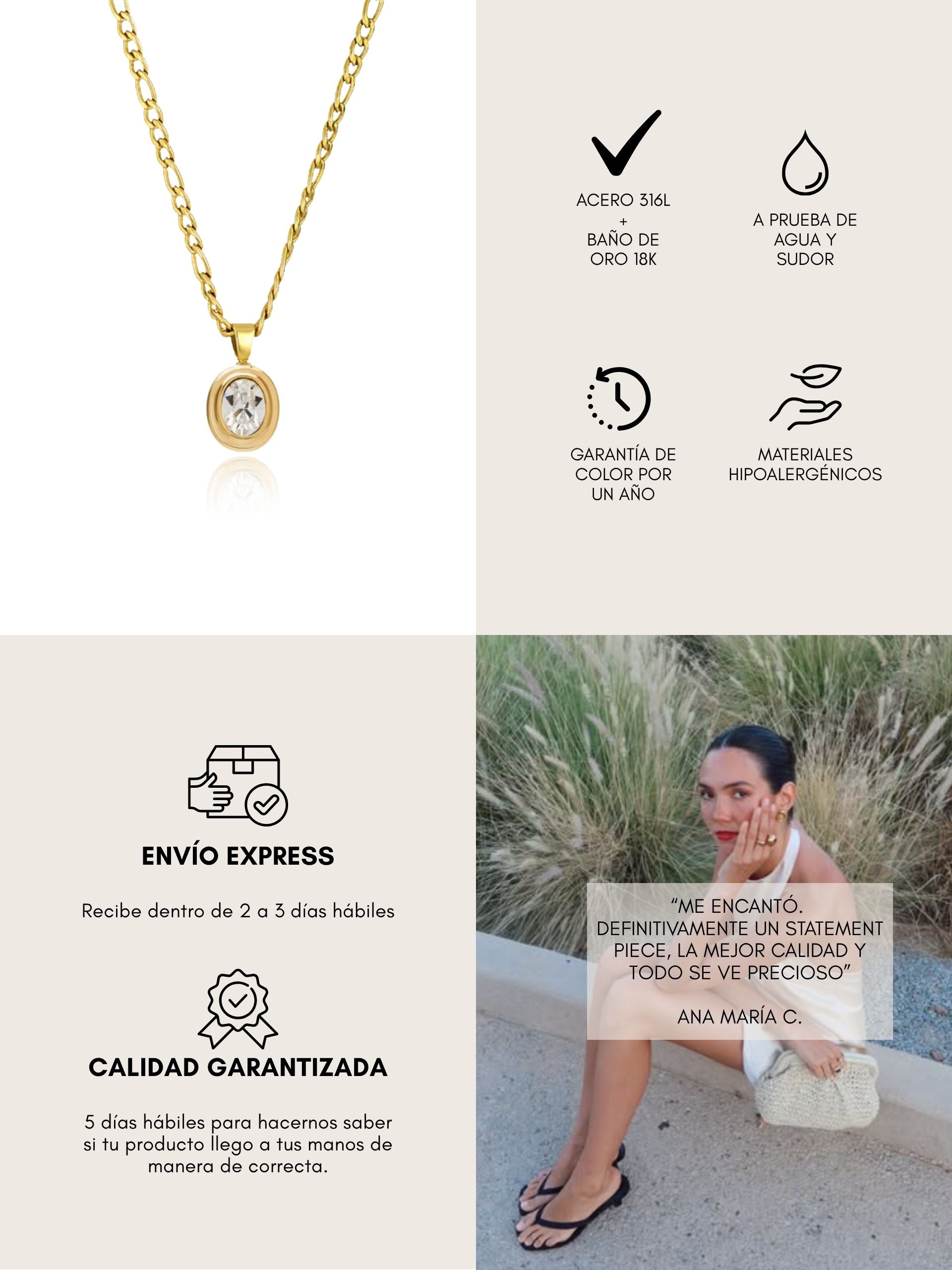 Todas nuestras piezas son de acero inoxidable resistente al agua, diseñadas para acompañarte todos los días sin perder brillo ni color.