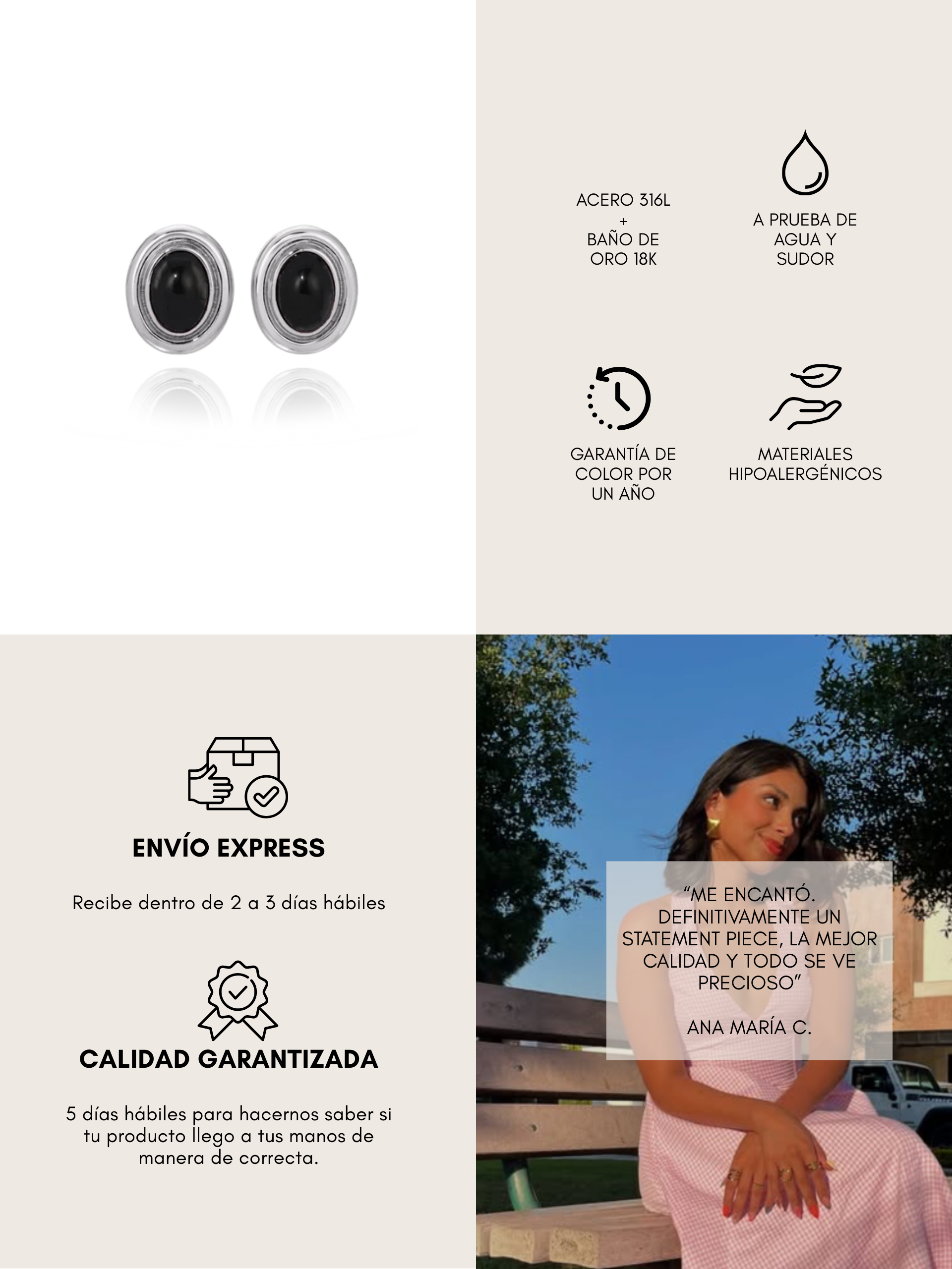 Todas nuestras piezas son de acero inoxidable resistente al agua, diseñadas para acompañarte todos los días sin perder brillo ni color.
