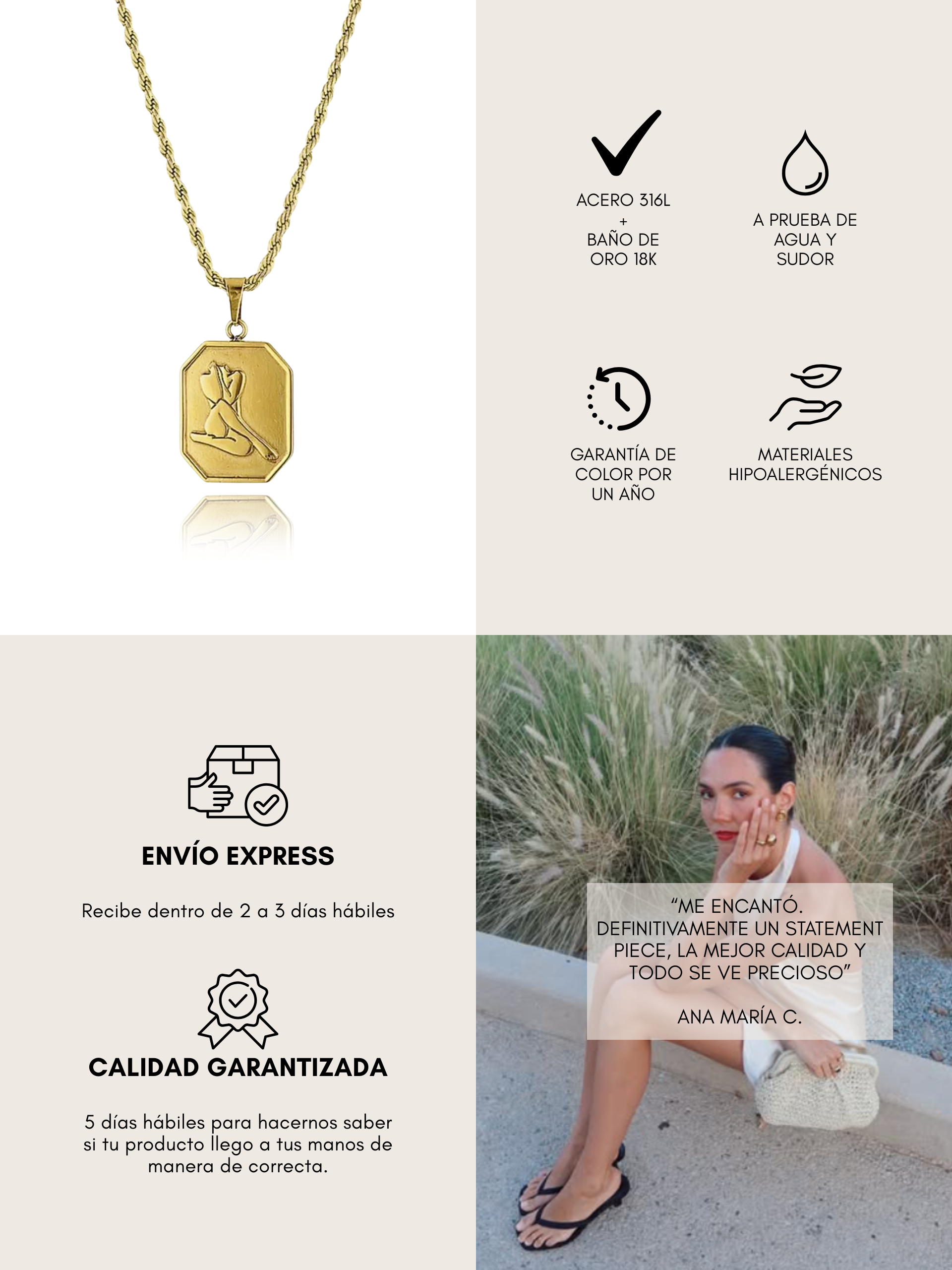 Fabricamos con acero quirúrgico 316 L y baño de oro 18 K. Resistentes al agua, sudor y vida diaria.