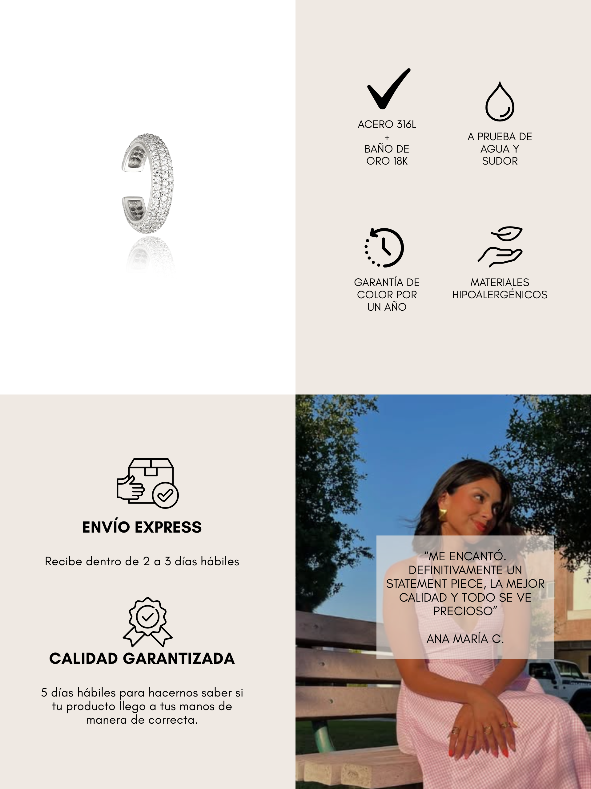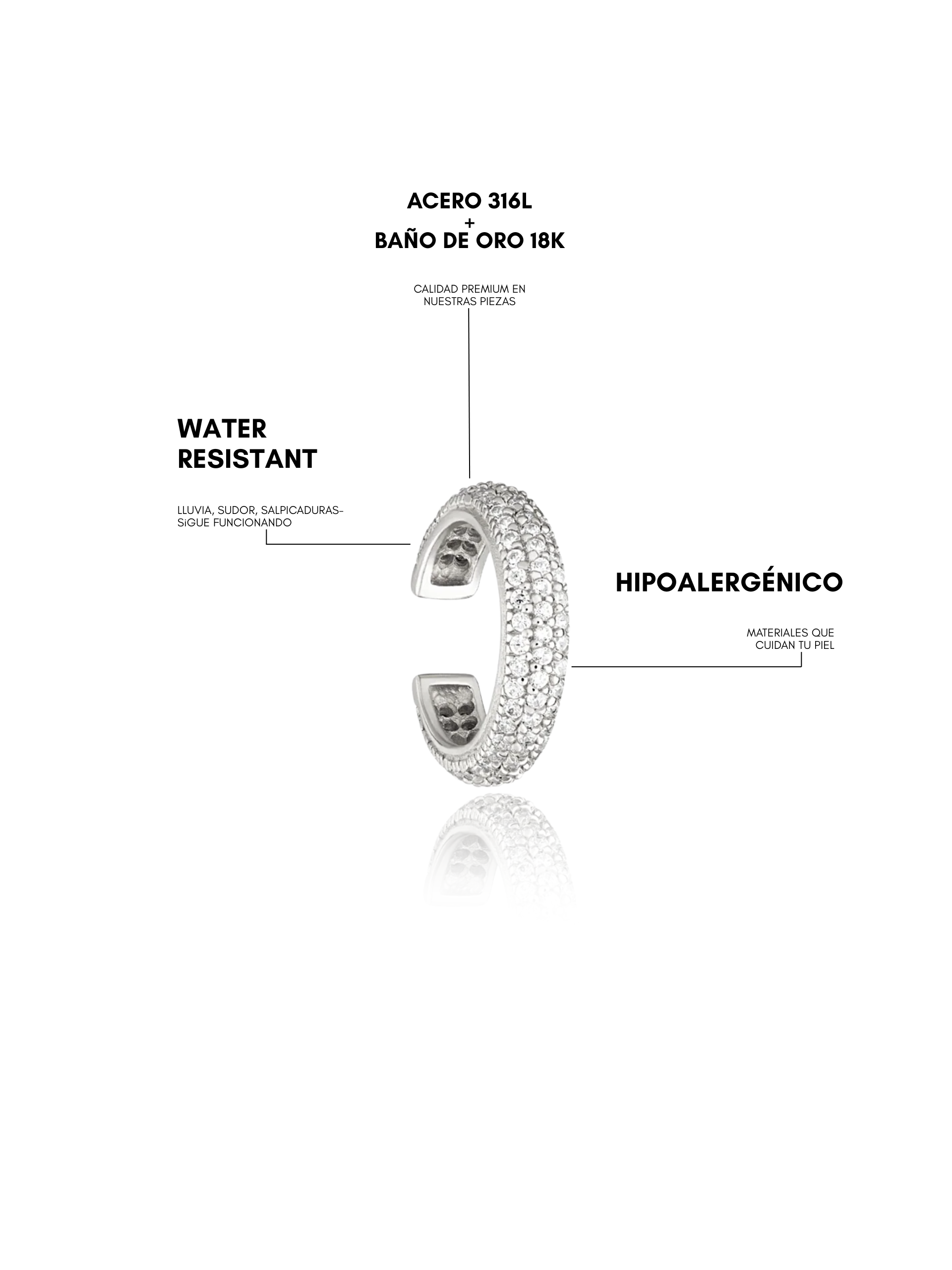 Todas nuestras piezas son de acero inoxidable resistente al agua, diseñadas para acompañarte todos los días sin perder brillo ni color.
