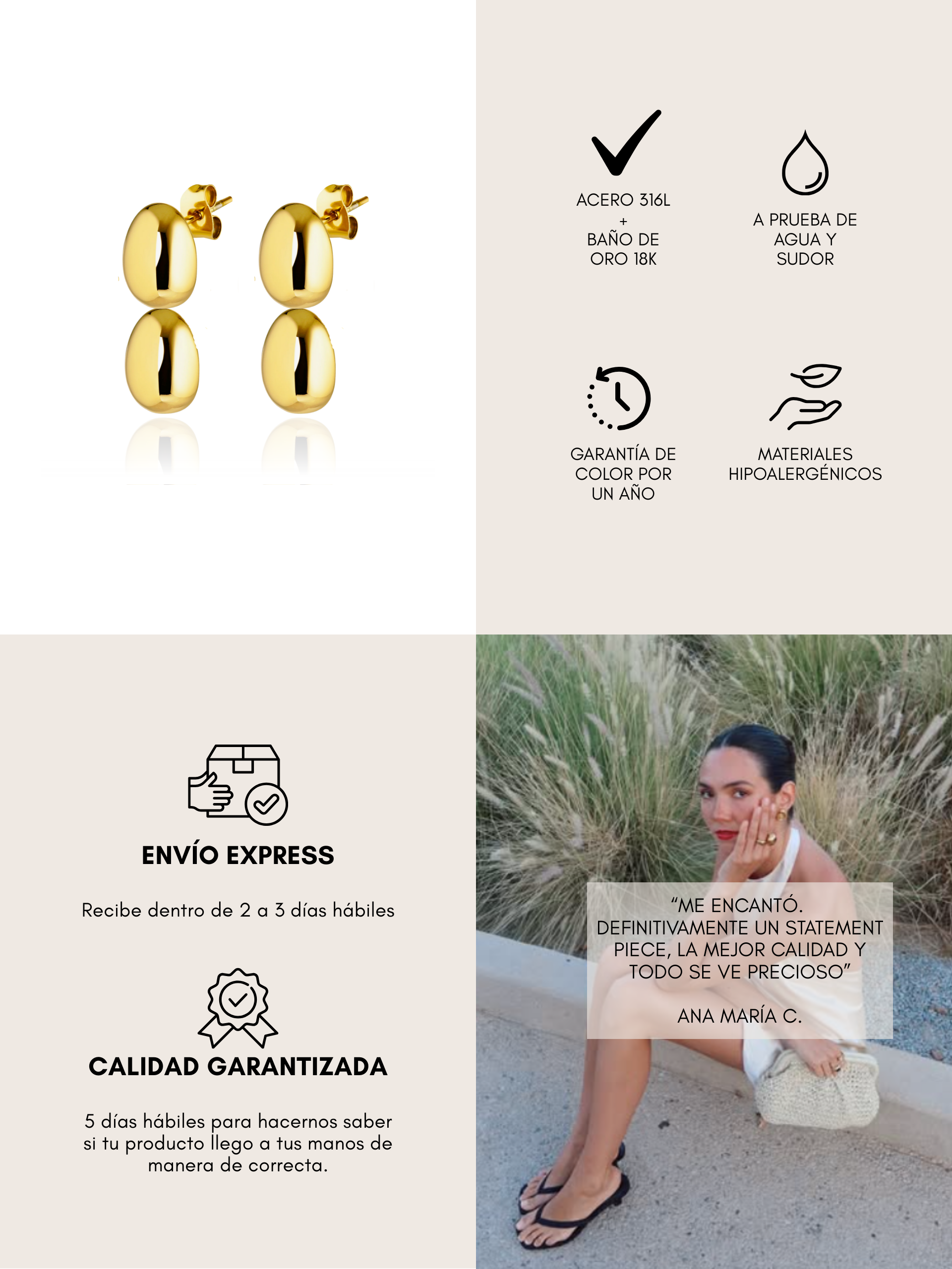 Todas nuestras piezas son de acero inoxidable resistente al agua, diseñadas para acompañarte todos los días sin perder brillo ni color.