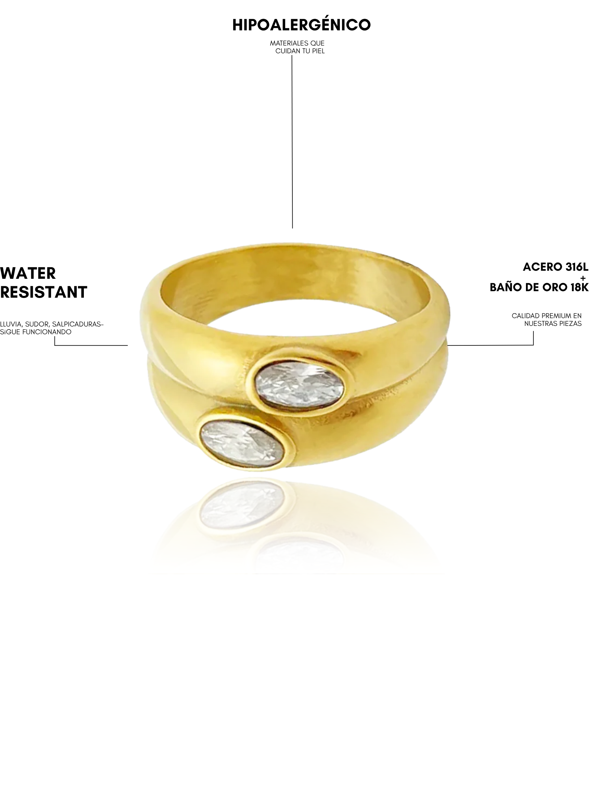 Acero 316 L con baño de oro 18 K, resistentes al agua y al uso diario.