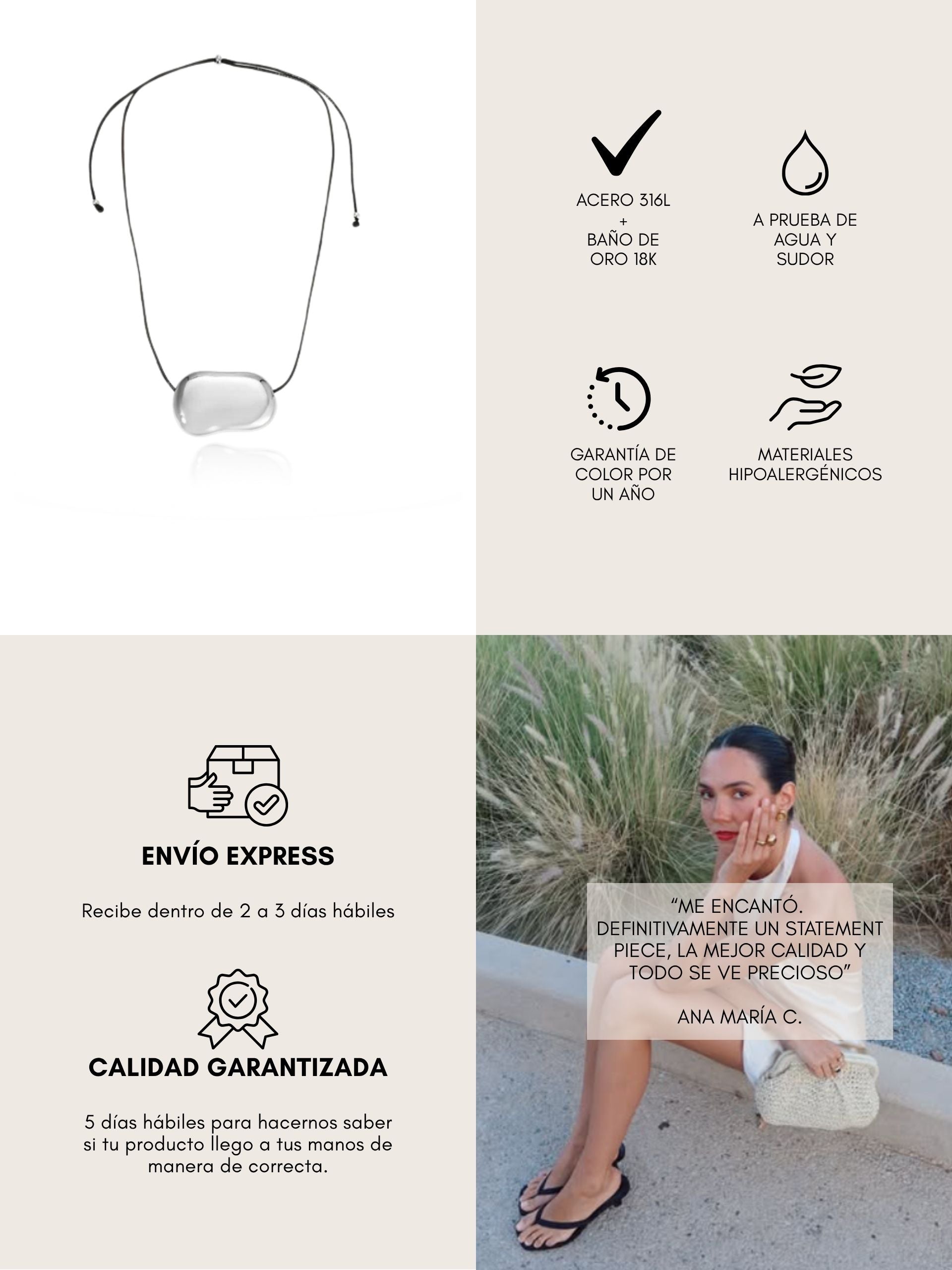 Todas nuestras piezas son de acero inoxidable resistente al agua, diseñadas para acompañarte todos los días sin perder brillo ni color.
